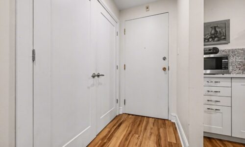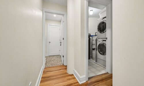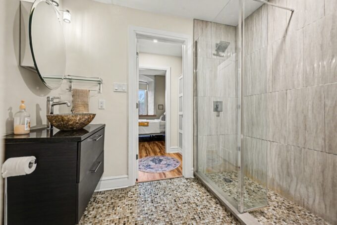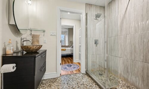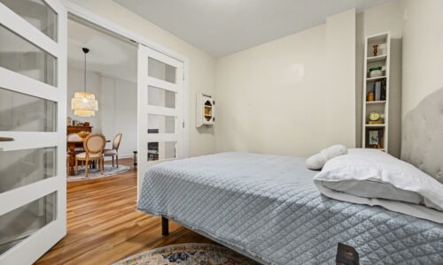 Retreat to the spacious primary bedroom, which offers double closets and a private entrance to a spa-like bathroom complete with a tasteful vessel sink and a custom-tiled glass walk-in shower. The versatile den, accessed through elegant French doors, currently serves as a second bedroom but is equally suited for a bright home office or creative studio. Unique to this unit is a dedicated separate laundry and storage room—a rare find in the building.