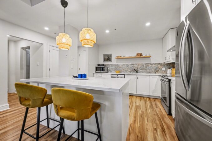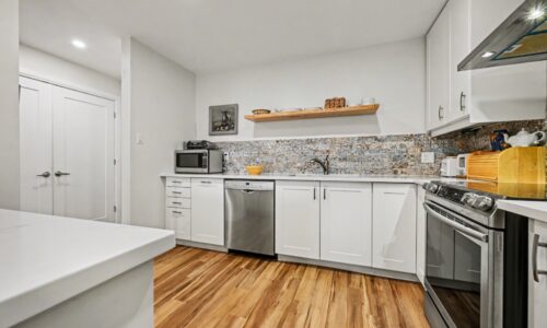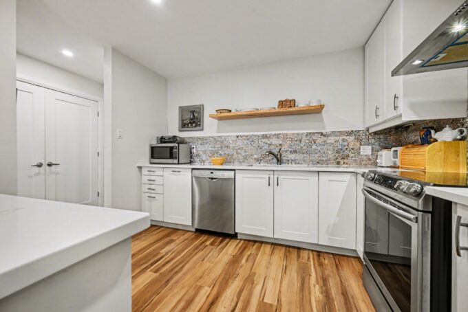 Crisp white cabinetry and elegant quartz countertops.