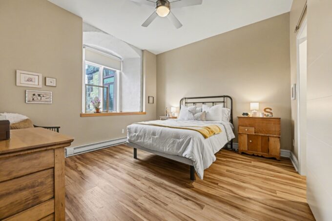 Experience the perfect blend of heritage charm and contemporary luxury in the historic Millfall Condominium. This meticulously maintained, fully renovated west-facing unit is bathed in natural light, boasting soaring 10-foot ceilings and expansive windows that frame serene, picturesque views of the Mississippi River and surrounding parkland.