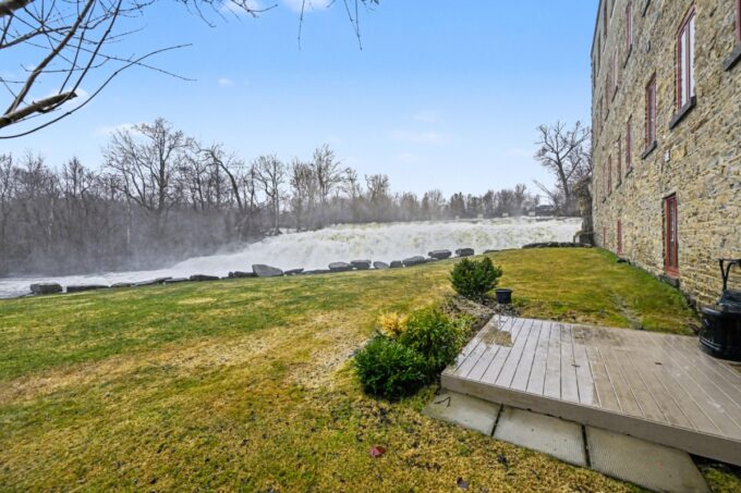 Outdoor Amenities: Water access, kayak storage, a gazebo, and picnic areas overlooking the rushing falls.